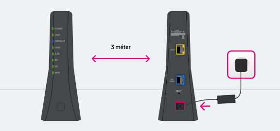 Helyezd a másik Telekom Wi-Fi Extra eszközt a Mesh vezérlőtől kb. 3 méterre (ez még nem a végleges helye lesz, az eszközök párosításáig kell, hogy ilyen távolságban legyenek), majd helyezd áram alá.