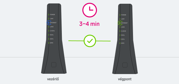 Az a Telekom Wi-Fi Extra eszköz, amelyiket a modemhez csatlakoztattál, lesz a Wi-Fi Mesh hálózat vezérlője, ez kerül vezérlő módba. Minden további Telekom Wi-Fi Extra készülék, amelyet csatlakoztatsz a Mesh hálózat egy-egy végpontja lesz.