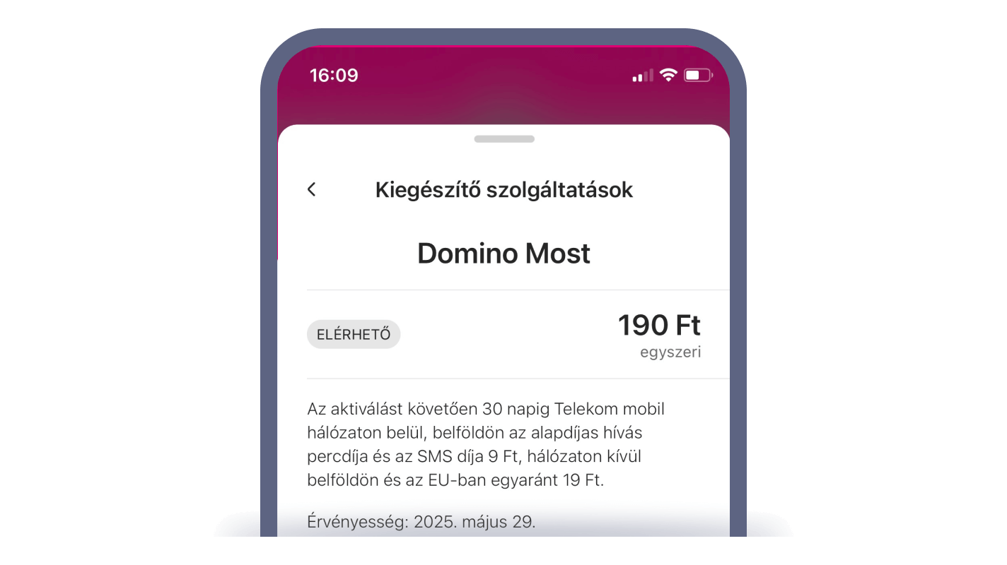 - A Domino Mostot a Telekom alkalmazásban, vagy a honlapunkon a "+Kiegészítő szolgáltatás" menüben a "Beszélgetés, SMS/Domino Most" menüpontban tudod bekapcsolni 30 napra.