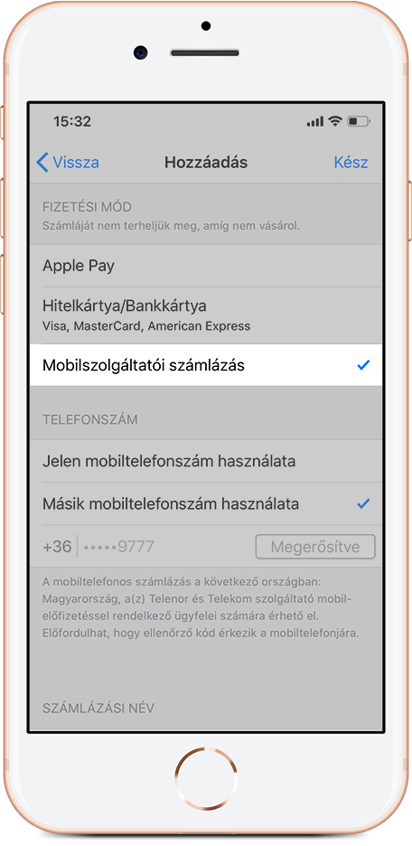A Fizetési mód hozzáadása pontban válaszd ki a Mobilszolgáltatói számlázást és a Jelen/másik telefonszám használata lehetőséget;