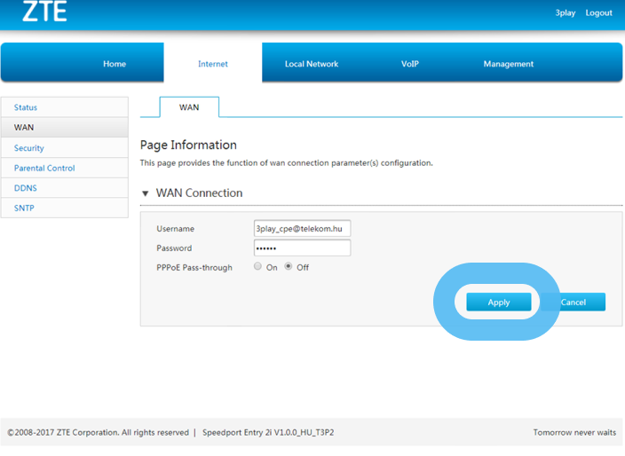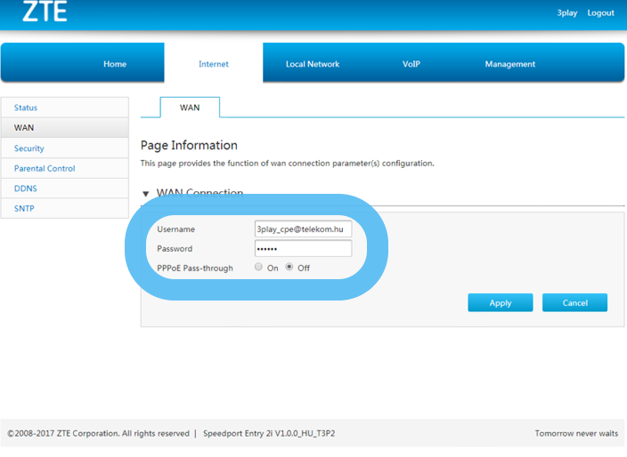 Töltsd ki a „Username” és „Password” mezőket a Telekomtól kapott adatokkal. Fontos, hogy a „Username” mezőbe a felhasználónevedet a @t-online.hu végződéssel együtt írd be.